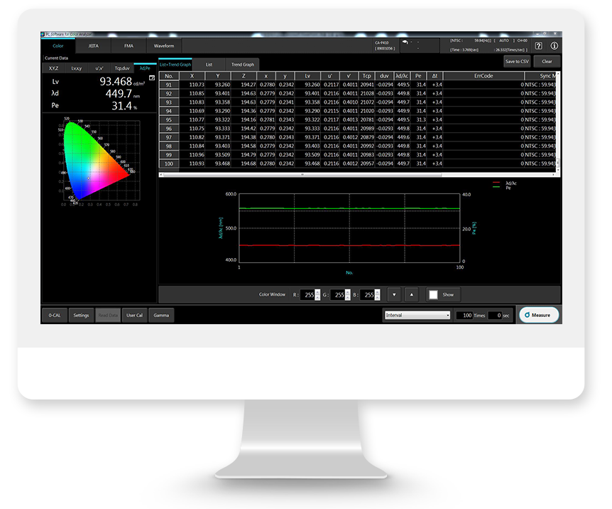 Probe를 통한 측정 데이터를 SW에 표시됩니다. 데이터는 X Y Z, Lv x y, u’ v’, Tcp duv, λd Pe로 동시 출력됩니다. 복수의 데이터는 Trend Graph를 통해 경향성 파악에 도움을 드립니다.